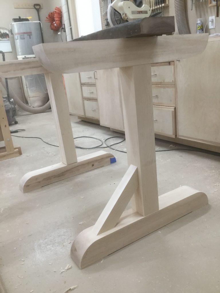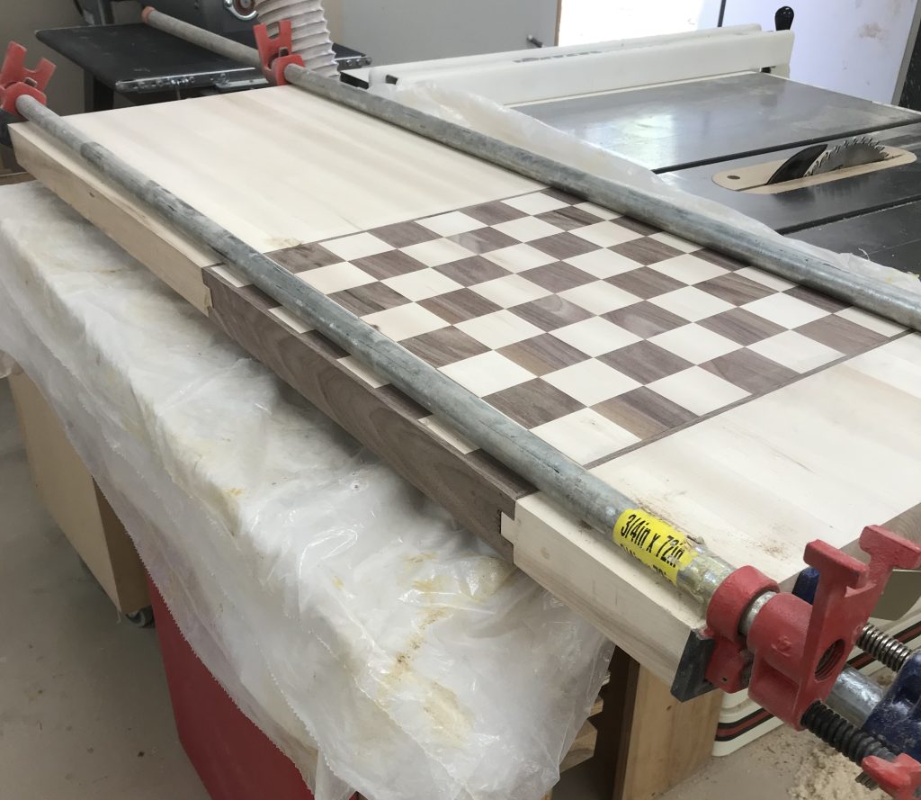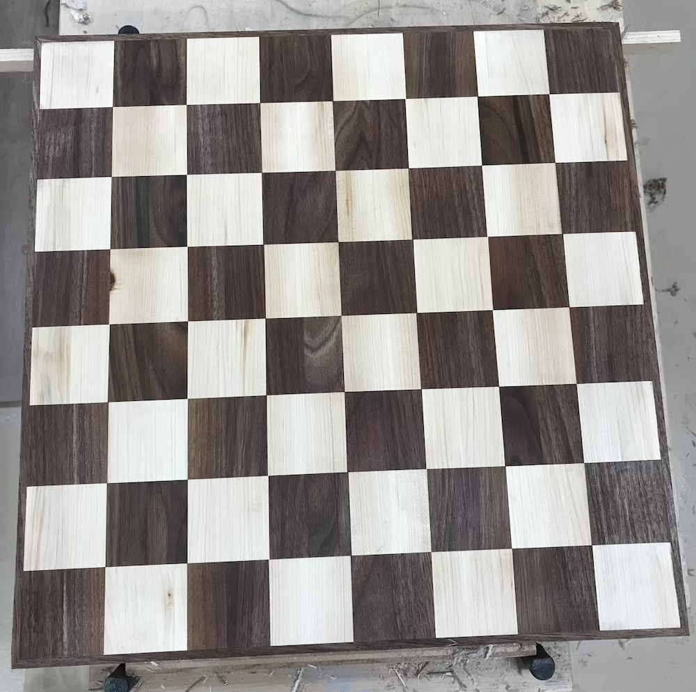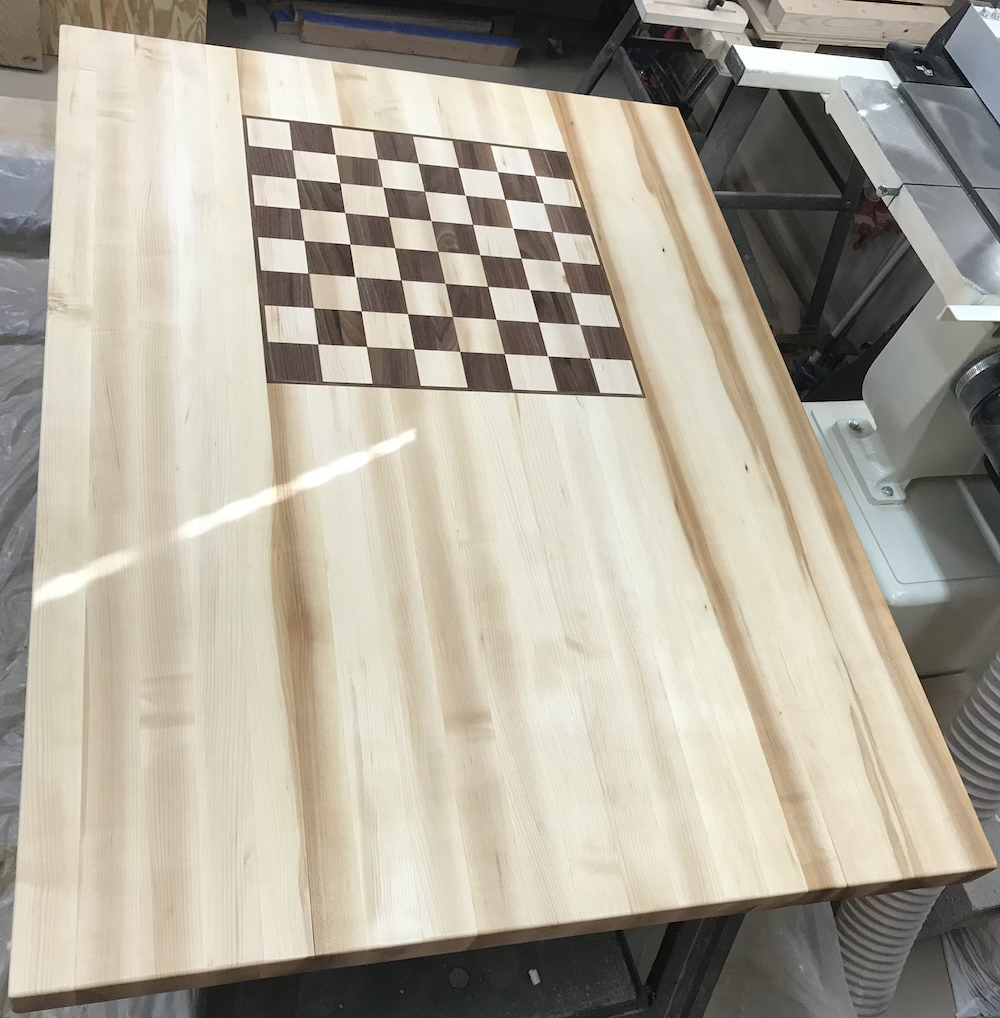 I just finished this rustic Butcher Block Kitchen Island with a built-in chessboard. It was a custom build designed and constructed to my customer’s exact specifications. It was sized specifically for my customer’s kitchen space and designed to be a fully functional butcher block cutting surface. It was glued up with 2” stripes of 8/4 maple accented with walnut for the chessboard and the bottom stretcher. It is also built to be transportable. It is built in four separate pieces, easily taken apart with two pins to hold the center stretcher in place. The extremely heavy and stable top is set on the trestle-style legs and held in place with four 5/8” metal dowels.