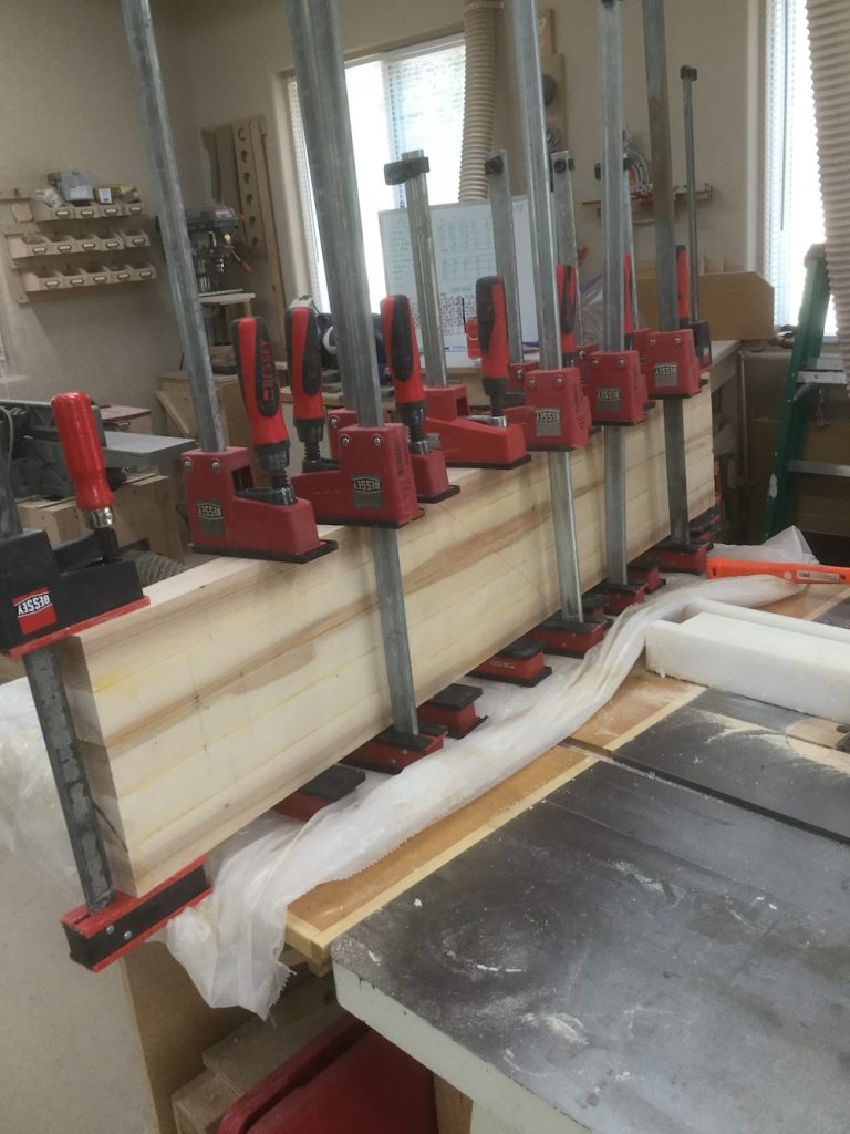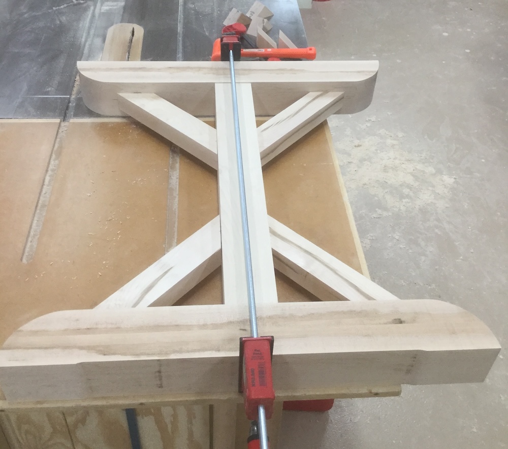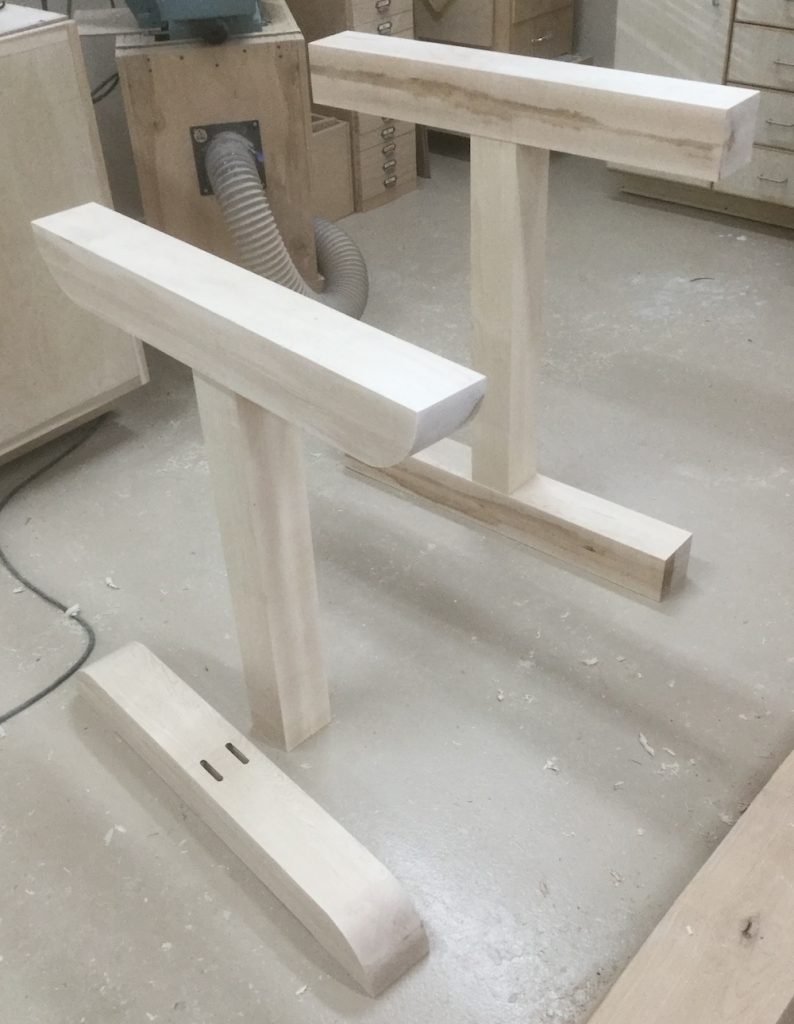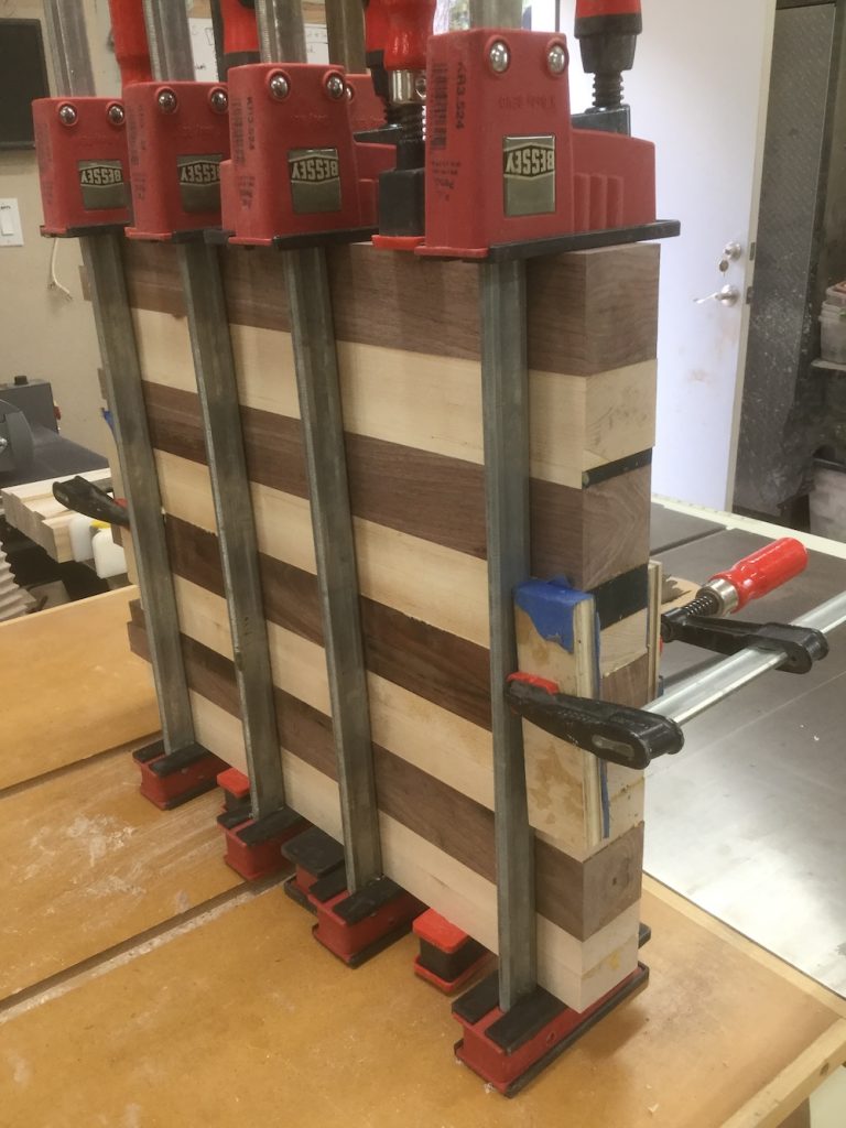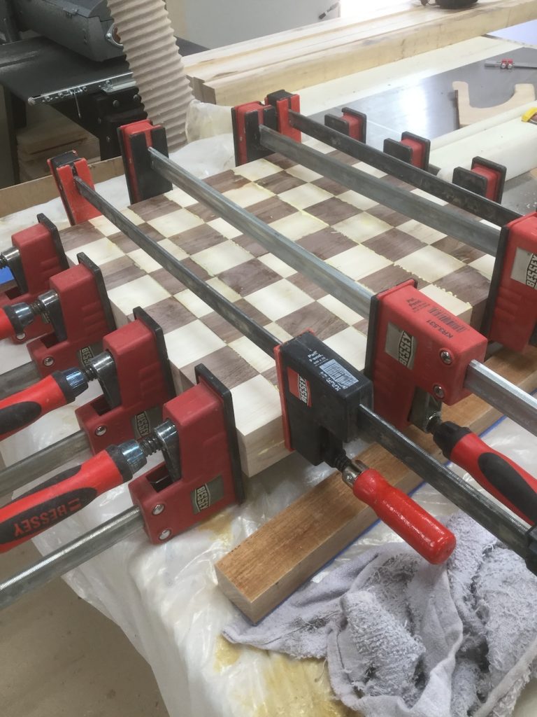 I just finished this rustic Butcher Block Kitchen Island with a built-in chessboard. It was a custom build designed and constructed to my customer’s exact specifications. It was sized specifically for my customer’s kitchen space and designed to be a fully functional butcher block cutting surface. It was glued up with 2” stripes of 8/4 maple accented with walnut for the chessboard and the bottom stretcher. It is also built to be transportable. It is built in four separate pieces, easily taken apart with two pins to hold the center stretcher in place. The extremely heavy and stable top is set on the trestle-style legs and held in place with four 5/8” metal dowels.