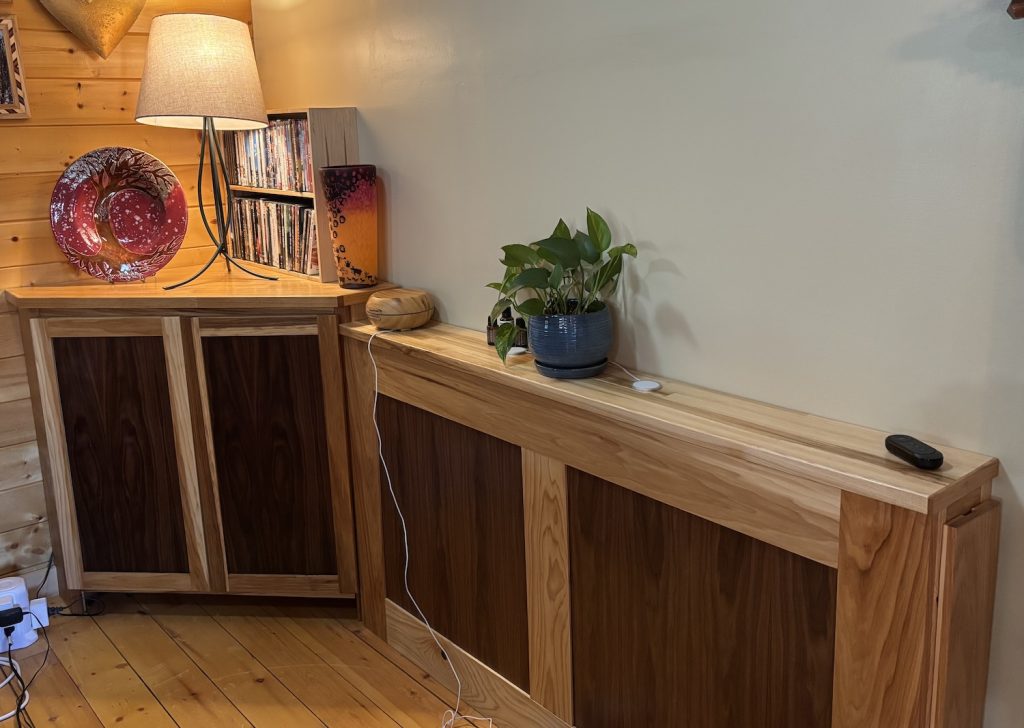 In May, I retired with 37 years of service in the Air Force. It was an amazing career with 20 years of active duty service and 17 years as an Air Force civilian. Over the past ten years, we’ve been working on a cabin in the woods to retire to. One of the challenges was making our 2200 sq ft house full of stuff fit in our 1000 sq ft cabin. These past few months, prior to the move, I’ve been trying to solve that problem with many different storage options — from a tiny shadow box to a storage space big enough for my bikes. Attached are some of my recent projects to help us fit into our new space. I started by building some new cabinets for the kitchen with handy pull-out shelves. Also, for the kitchen, I built a cabinet for our trash can; having a dog means closing up the trash. In our living space, we had a corner that was basically wasted — now it’s storage for blankets and other little-used items. Right above the corner cabinet is a small set of shelves for our DVD collection (yep, we might be a little old school). I built a small cabinet for random items that we need to access easily for our front room. All the pieces in the cabin are made with hickory and walnut to match all the other items I’ve made over the years. I also built a package box for any deliveries we receive. It mostly keeps our packages from getting wet, but it might also deter the average thief. And while the photo attached is of the bike shop under construction, it is actually complete and packed with bikes!