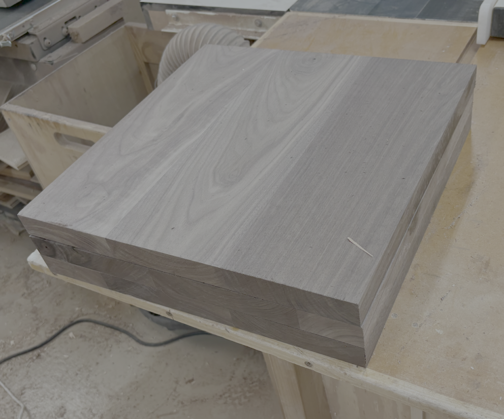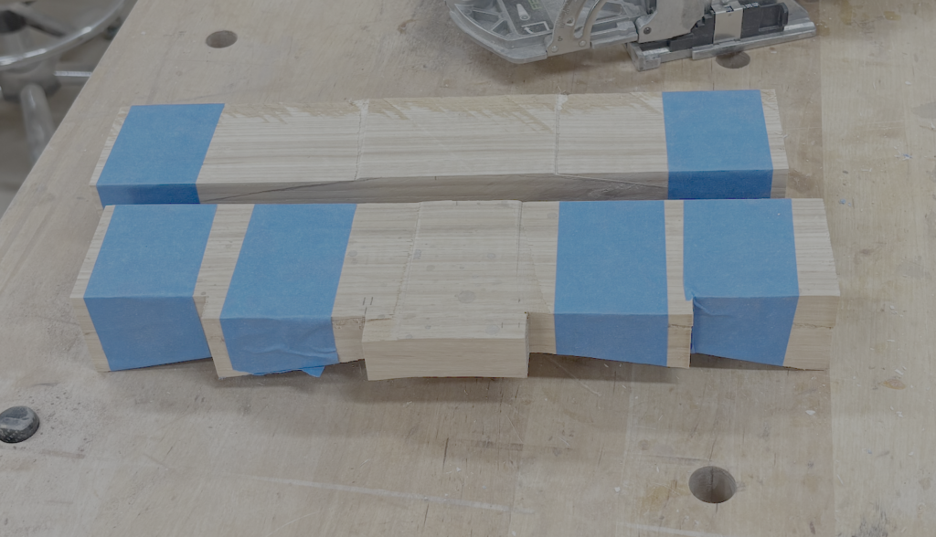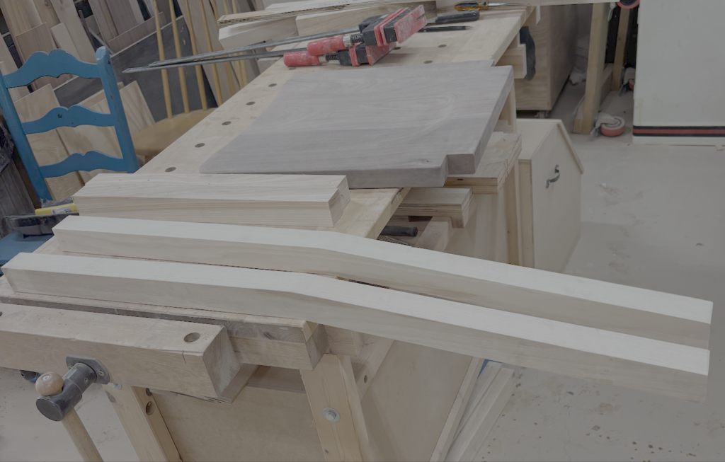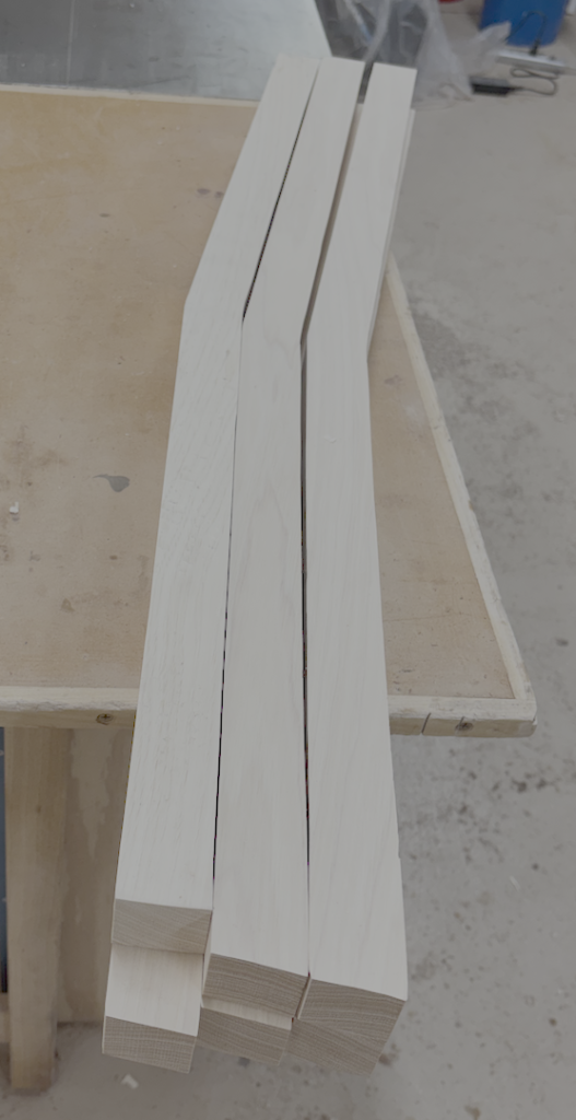 I should say something about the legs. I don’t know the exact angle of the back legs, but I used a solid piece and cut the back leg with a slight angle to make it more comfortable for sitting. I started with a blank from a piece of birch plywood and sanded the edges perfectly smooth. I rough-cut all the legs on the bandsaw and then took them to my router table with a large pattern bit and carefully cut them to the pattern. It was challenging and required a lot of up-cuts to avoid going against the grain. While there were many challenges in this build, cutting along the legs with a pattern bit was one of the more challenging. It ranks up there with cutting the dip in the seats.
